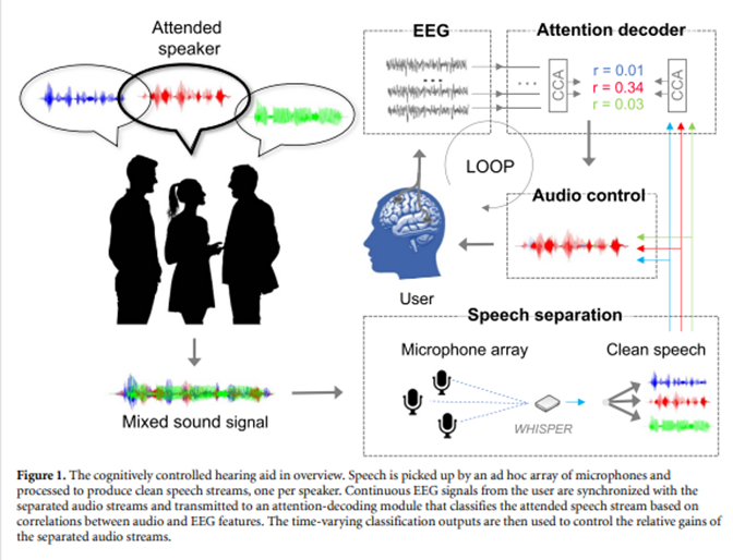 La tecnología multi-micrófono y la conectividad inalámbrica permiten capturar múltiples fuentes de sonido. Aún más importante, existen diversas formas de decodificar la atención y la intención del usuario en tiempo real: mediante eye-tracking (seguimiento ocular), sensores de movimiento, o el Ear-EEG (registro de la señal neural desde el oído). Ver Hjortkjær, J. et al. (2025) para más información. Esto permite un control en "tiempo real" (bueno, casi) del audífono basado en la atención del usuario.