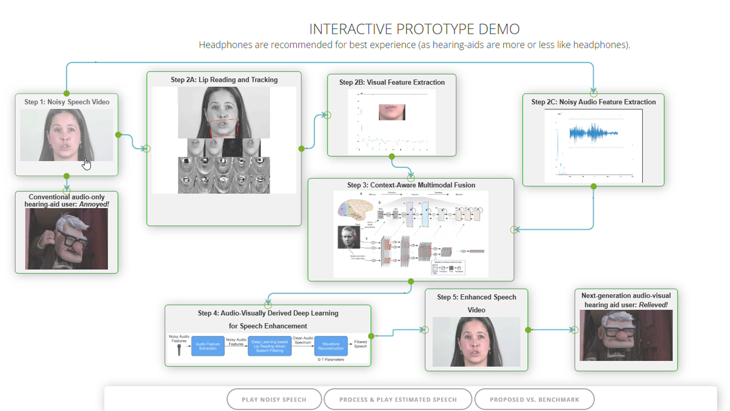 Los algoritmos son ahora capaces de decodificar los movimientos faciales y de la boca para estimar el discurso. Esta tecnología, utilizada en la generación de subtítulos, se aplica a la reducción de ruido. La integración de dispositivos visuales con cámara (como las gafas Rayban Meta) con los audífonos promete resultados impresionantes al combinar la información auditiva y visual para aislar la señal de interés.
